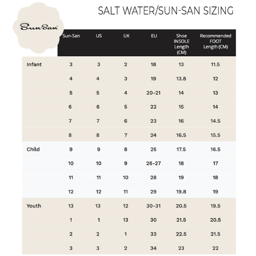 Voor de juiste maat raden wij aan om de Salt-Water Sun San maattabel te gebruiken onderaan bij de productfoto’s. Gebruik alleen de size chart die bij het desbetreffende product staat, want per soort sandaal verschillen de maattabellen. Twijfel je over de maat? Stuur ons gerust een berichtje, dan kijken wij even met je mee.