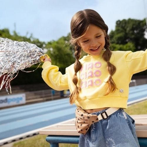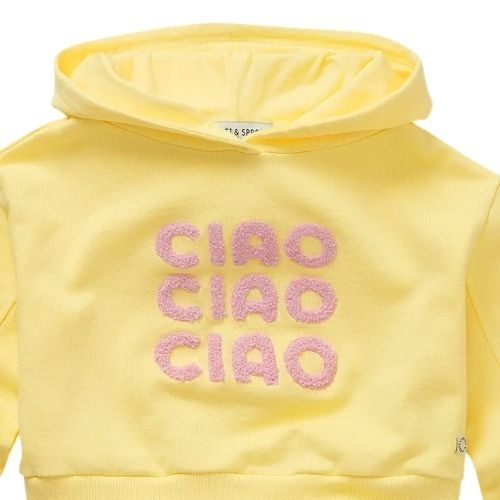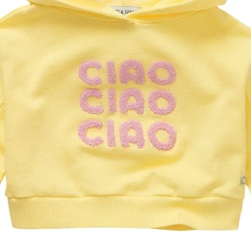 De Sproet & Sproet boxy hooded girls sweatshirt pastel yellow trui bestel je online bij Labels for Little Ones. Deze te gekke trui met capuchon is uitgevoerd in een lichtgele kleur met roze tekstprint ‘ciao ciao ciao’ op de voorkant. De Sproet trui heeft