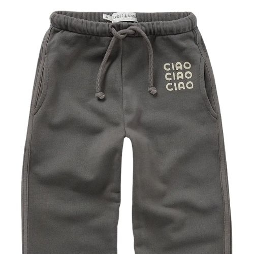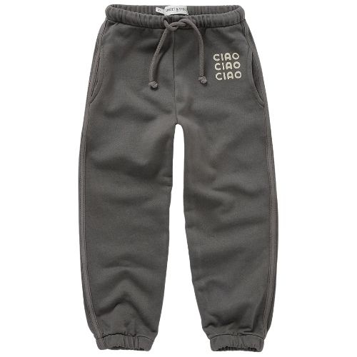 De Sproet & Sproet sweatpants washed black washed black broek bestel je online bij Labels for Little Ones. Deze mooie jogger is uitgevoerd in een kleur washed black. De sweatpants heeft elastiek in de taille met trekkoord, twee zakken en een tekst rpint ‘ciao ciao ciao’ op de voorkant van de broekspijp. De broek heeft een comfortabele fit door de zachte biologische katoenen stof en fijne pasvorm.