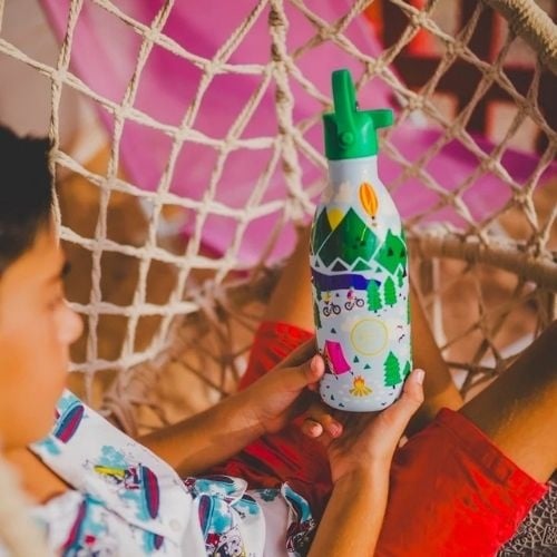 De The Kids Bottle - outdoor adventure 500ml drinkfles bestel je online bij Labels for Little Ones. Een leuke drinkbeker die handig mee te nemen is onderweg of naar school. De geïsoleerde waterfles houdt dranken 18 uur lang warm en 36 uur lang koel. De fles is handig in gebruik voor kinderen en de beker is te gebruiken met en zonder rietje. Uitgevoerd in een vrolijk en origineel design met kampeer thema.